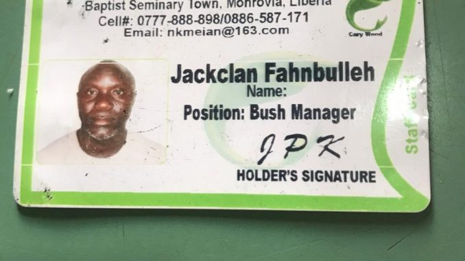 An ID Card in his possession identified him as an employee of Cary Wood Company Inc in Baptist Seminary Town on Roberts International Airport Highway, where he works as Bush Manager.